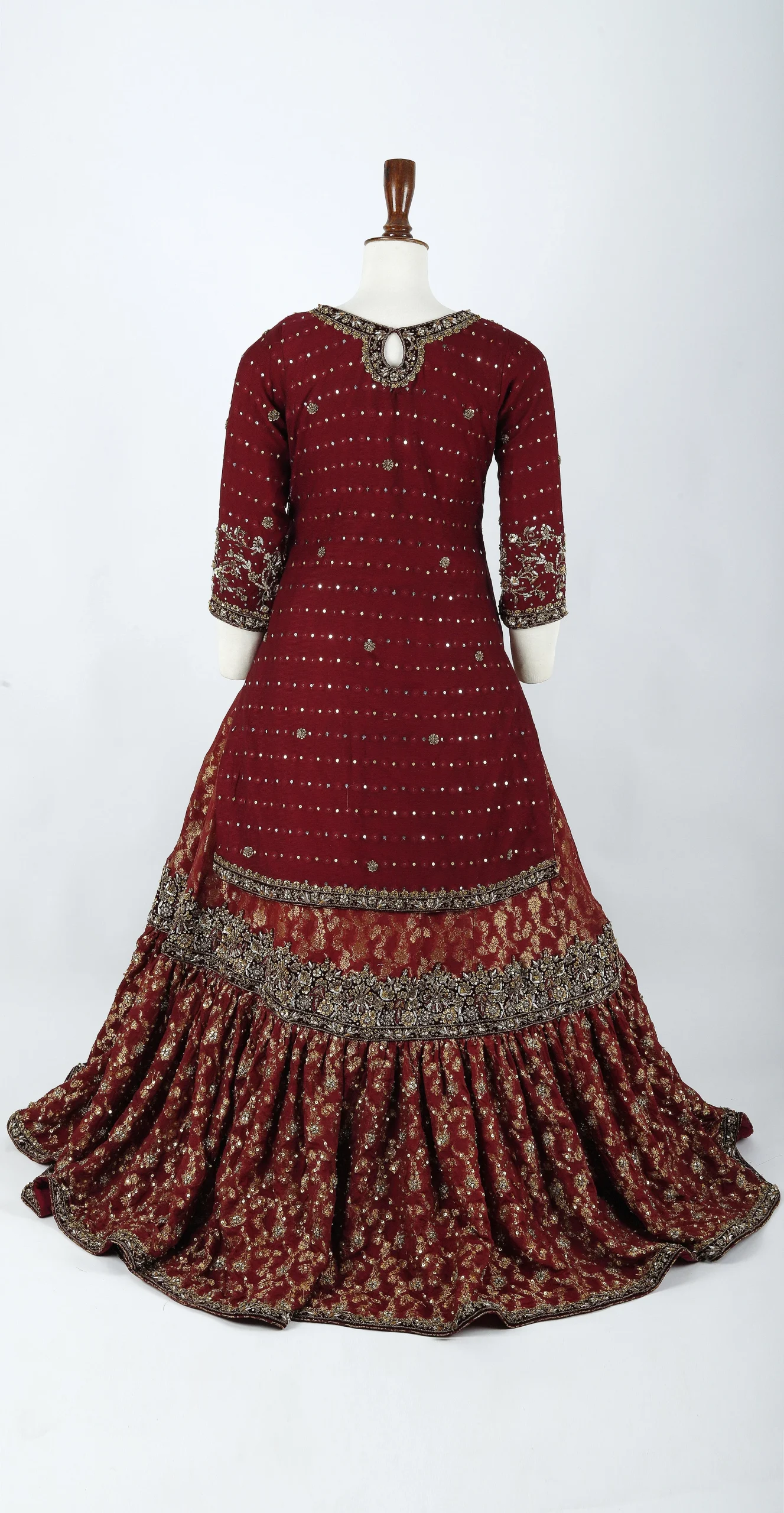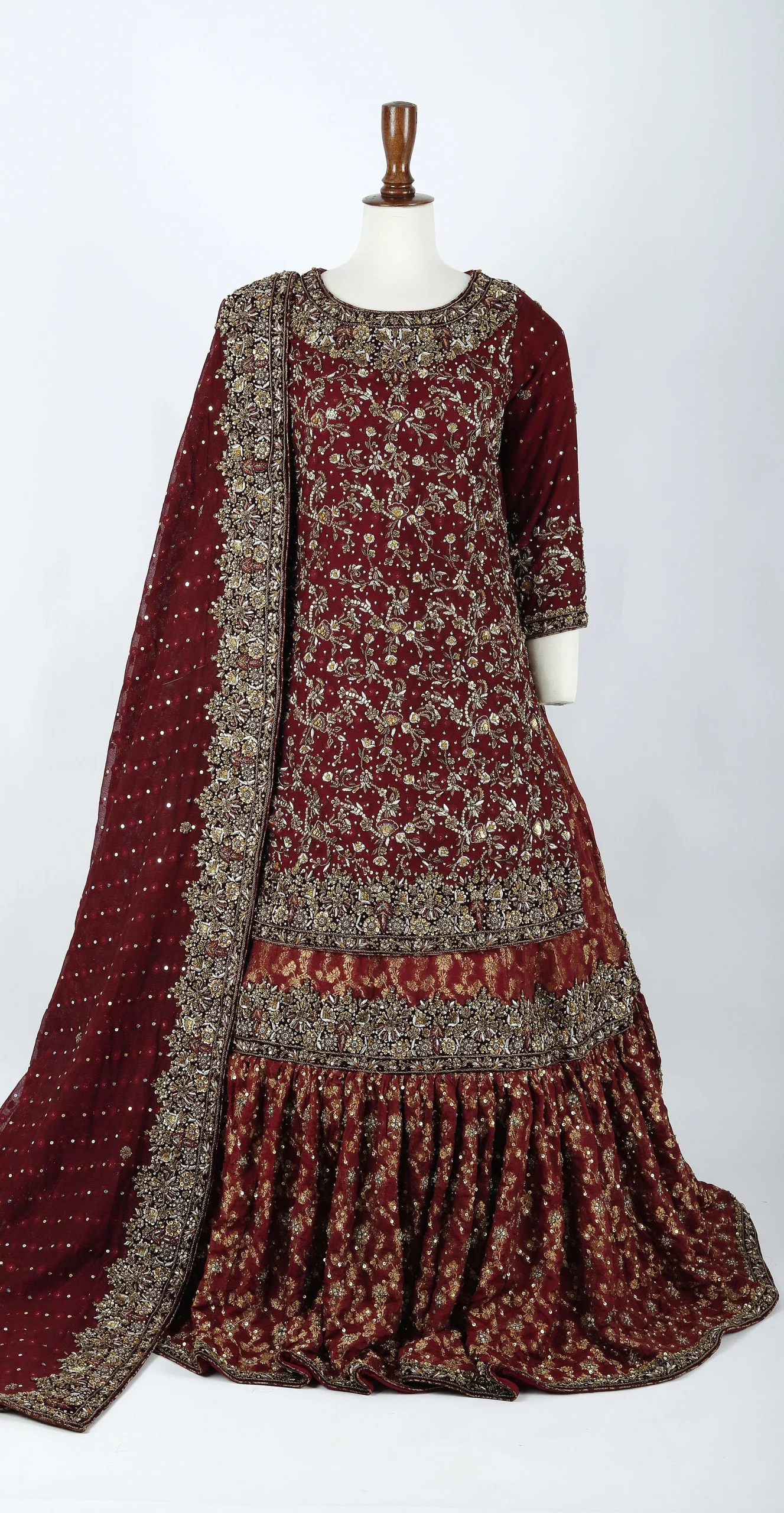 Description: This bridal farshi is adorned with exquisite hand work, qoura dapka, Traditional kacha antique work, embellishments such as intricate zardozi and sharara heavy chan fillings